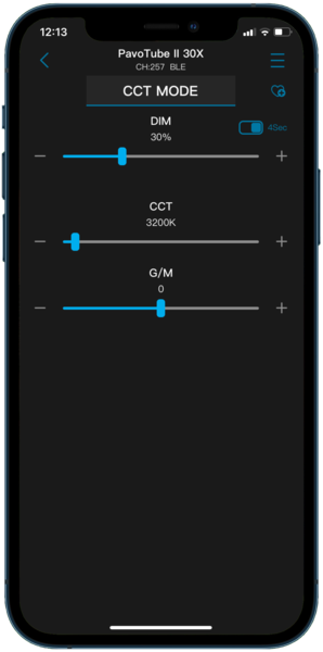 When you have your fixtures paired with the NANLINK app, they will appear on the screen. When you tap into a light, you will see the controls of the current mode of the fixture.
