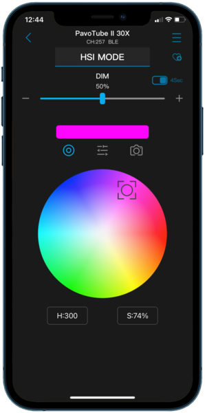 You can adjust the HSI by moving your finger in the color wheel, or tap the faders icon in the center. The camera icon accesses the camera on your mobile device: you can quickly snap a picture and select a color from the photo to instantly send to your PavoTube II X.