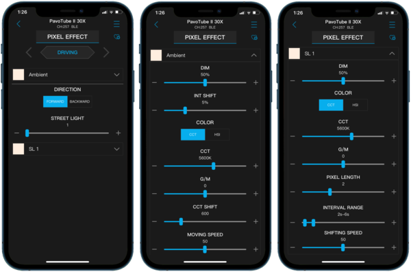 To get a better idea of the depth of the parameter controls, let's take a look at the options in the new Driving pixel effect in the PavoTube II X-Series tube lights. This effect mimics the look of lights passing by outside a vehicle, making it easier to capture more realistic and engaging interior shots of your subjects inside cars.